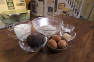 Next, combine flour, sugar, baking powder, baking soda, and salt in a large bowl. In a separate bowl, beat together buttermilk, beets, eggs, and milk.
