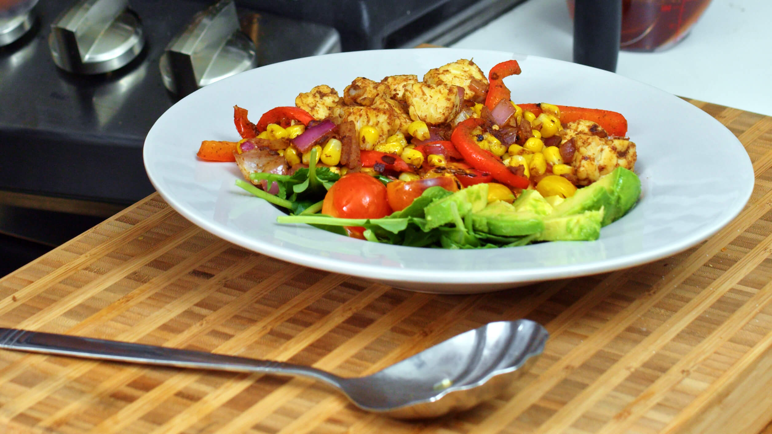 - Crumble or dice tempeh into small pieces and add to the skillet. Add corn and cook till all warmed through, 2-3 minutes.