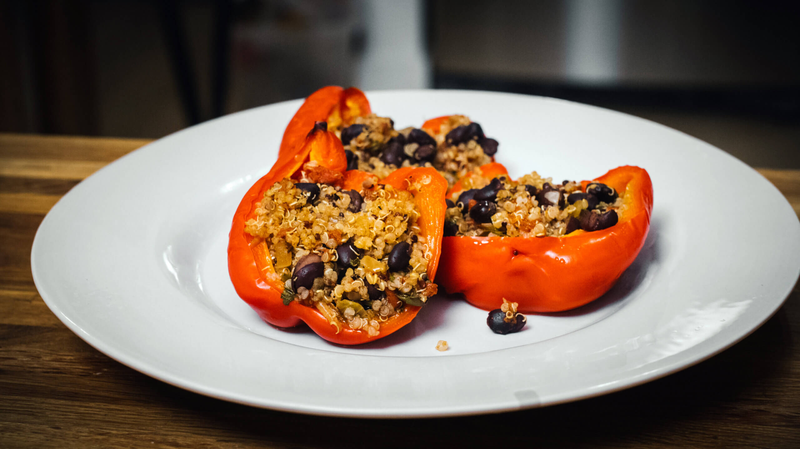 - Remove skillet from heat and mix in quinoa, beans, lime, and cilantro. Scoop one-quarter of the mixture into each pepper.