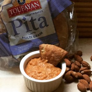I love a good spicy, smoky Romesco and the addition of Toufayan Multi Grain Pita and white beans provides more plant-based protein. Woo hoo! 🙂