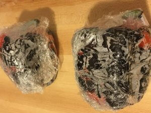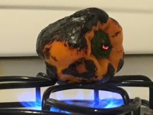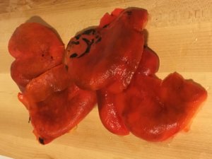 a. place them whole directly on gas burners to roast, turning occasionally and allowing the skin to blacken. Once skin is blackened, wrap peppers in plastic wrap and allow to steam. Once cool, unwrap peppers, peel off blackened skin under cold running water, and take out seeds and membrane (see the following pictures). If using jarred roasted peppers, skip to step 2.