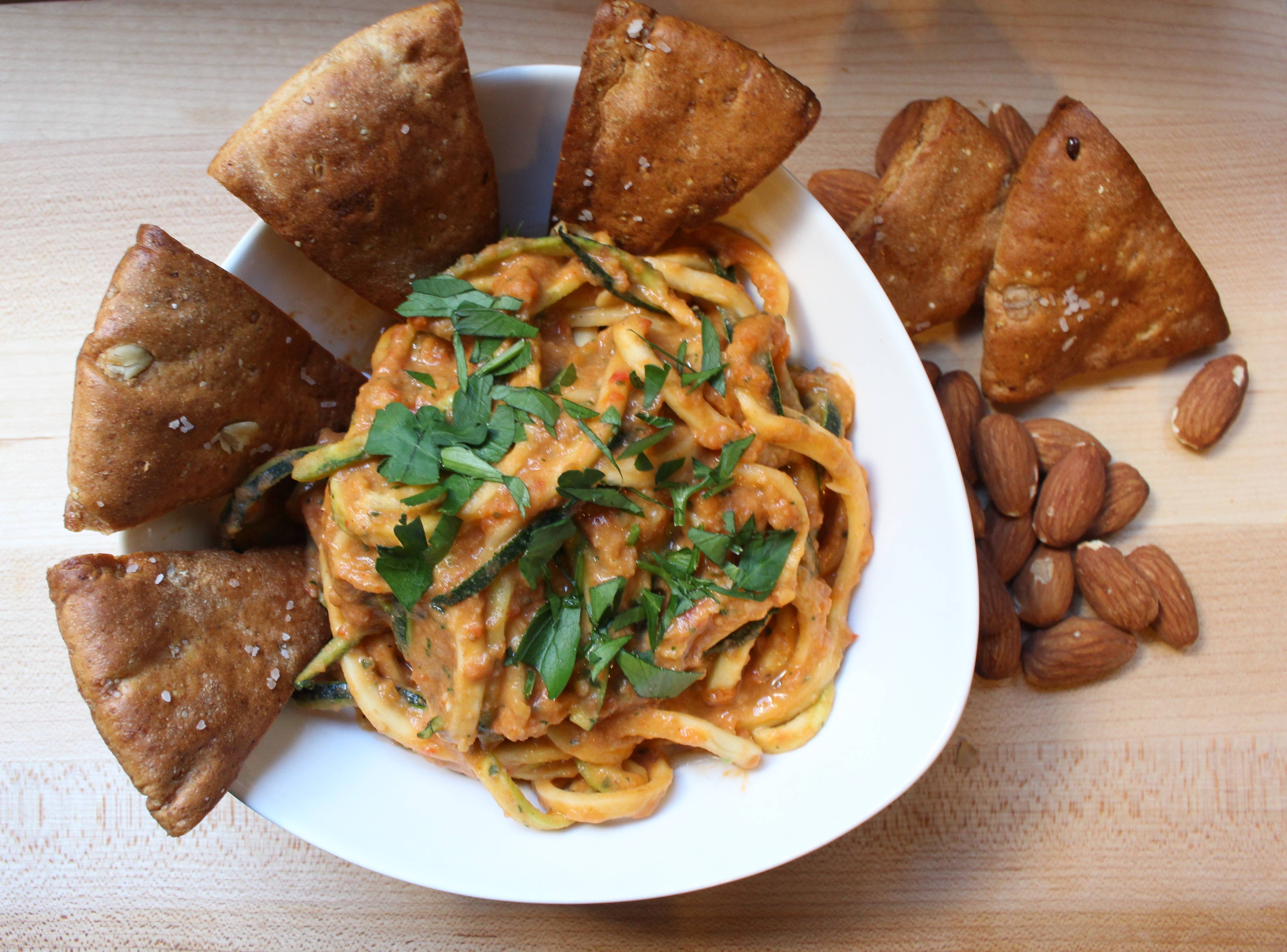 White Bean Romesco Sauce with Zucchini Noodles and Toasted Pita Points